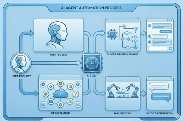An AI agent is a more advanced AI system. It does not only chat. It can also understand a goal, break it into steps, and do the work.