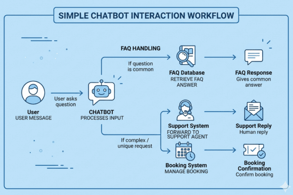 Diagram of chatbot handling FAQs, bookings, and customer support. Visual explanation of how chatbot solutions work in businesses of Chatbots for Business